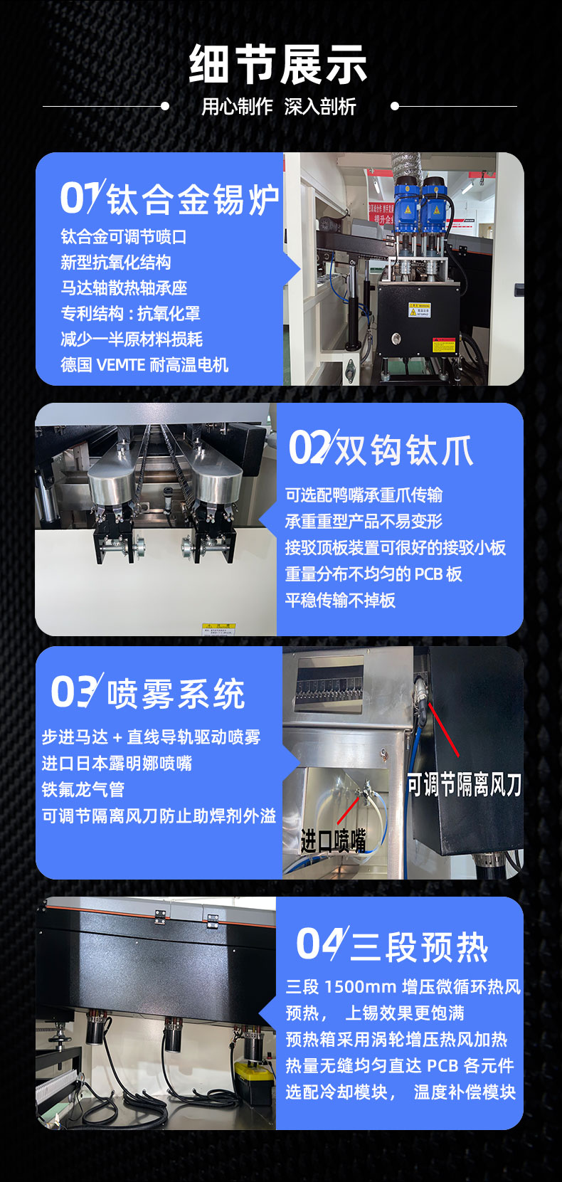 ● 自動定位噴霧和噴錫,步進電機驅動噴霧,可調節式噴錫口設計,同比減少25%電量和輔料的消耗