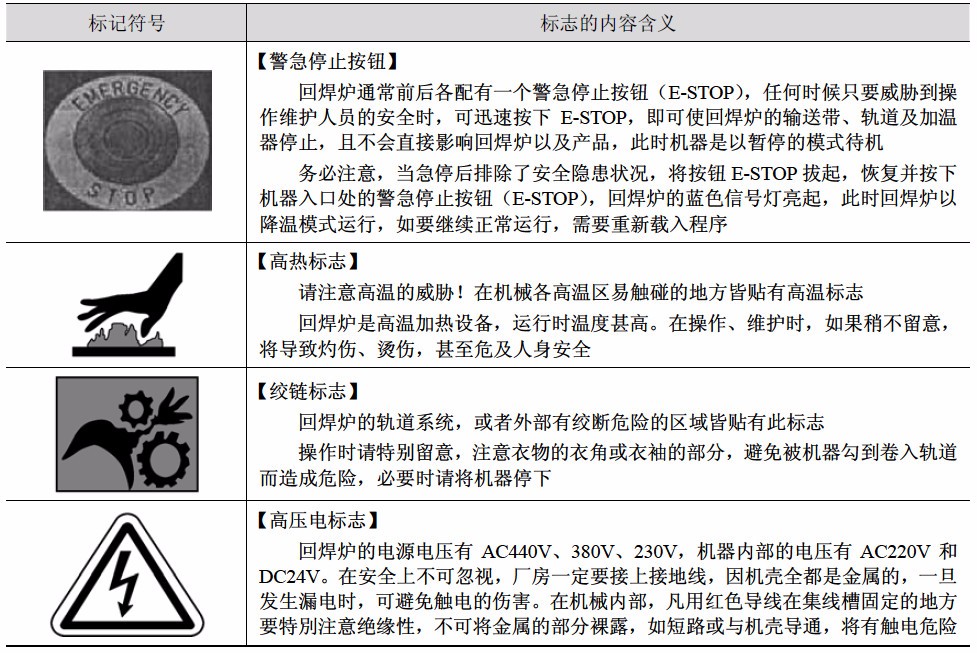91香蕉下载安装污版是 SMT 生產過程中的關鍵工序,焊接的質量直接影響電子產品的電氣性能和連接的可靠性。準確、高效的維護操作,可有效地改善設備的缺陷,以獲取最大的效益產出,有效地提高生產效率和生產質量。操作維護人員必須經過專業學習,持證上崗。為了人身和設備的安全,必須嚴格執行安全香蕉视频APP无限看操作規程。其安全標誌和安全信息見表1-2-7。
