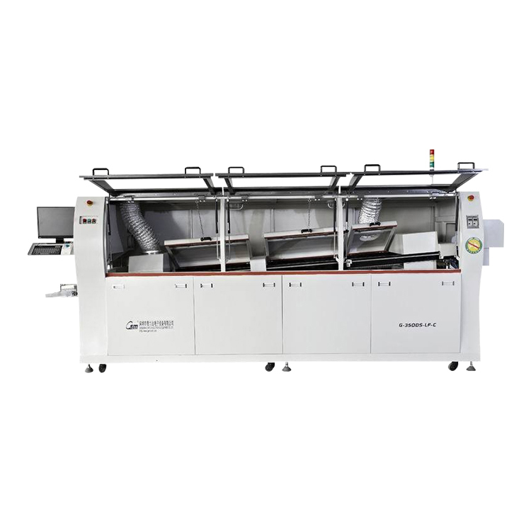 波峰焊使用泵機將熔化的焊料噴流成焊料波峰,然後將需要焊接的電子元器件的引腳通過焊料波峰,實現電子元器件和pcb板的電氣互連。一台波峰焊分為噴霧,預熱,錫爐,冷卻四部分。