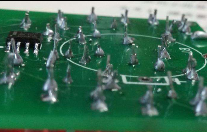拉尖大多發生在PCB銅箔電路的終端。PCB經過波峰時,PCB上的液態料下墜受到限製時就會出現此現象。在高頻、高壓電路中,尤其需要注意此類缺陷的危害。