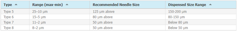 u 針頭內徑至少是焊料顆粒大小的五倍才能有效避免出現堵塞問題。常見的錫膏顆粒大小和針頭大小關係如下: